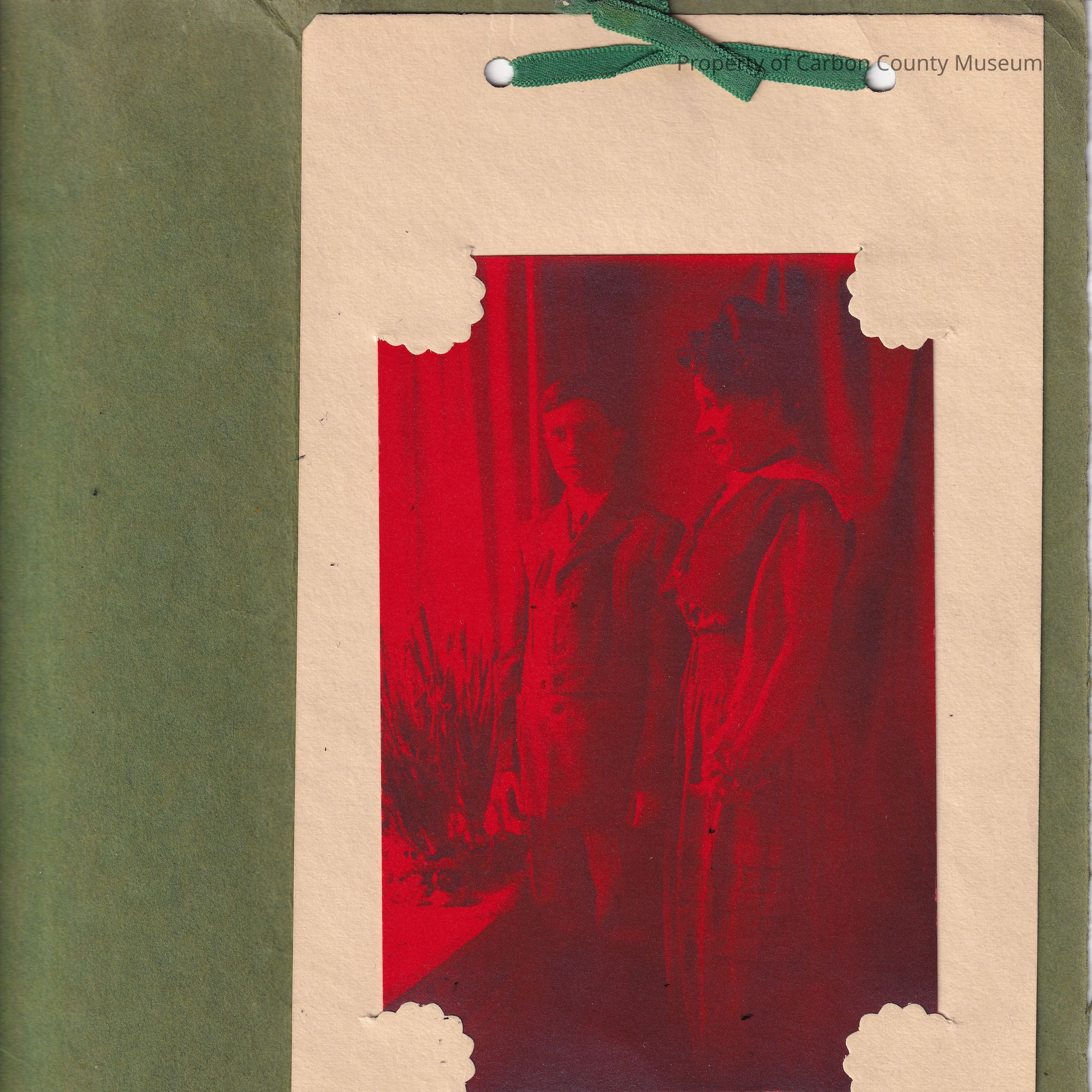 A photograph with a red exposure, features a young man and a woman - possible son and mother - standing beside an unknown object. Photograph is secured to a backing via friction hold, backing is tied to a green cover.Collection