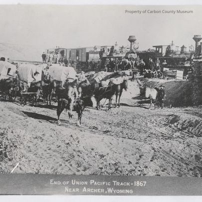 Printed on bottom in white: "End of Union Pacific Track - 1867 Near Archer, Wyoming"