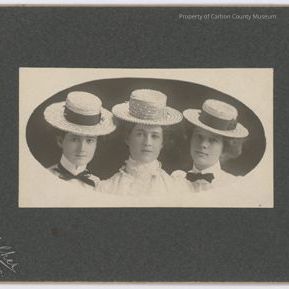 Update - 2009: Black & white print. Studio portrait. Mounted on dark grey matboard. Head & shoulders image of three young women wearing flat-brimmed straw hats. Women all dressed in white - woman on each end has dark bow/ribbon tie at neck.