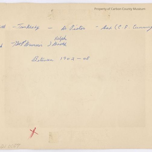 Written on back in blue ink: "Front - Tom Ready - Dr. Pistor - Dad (C. E. Cunningham){ Back - George Brimmer Ralph T. Booth" "Between 1902 - 08".