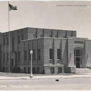 Black & white print card. Image of a multi level light colored brick building. Center portion is one level higher than front or back sections. Five steps lead up to front door that has windows above & around door. Embossed above door: "City Hall". The building has multiple windows on every level with another door on side. The back portion has large drive in doors. There are two pole lamps with glass globes on top of the street corner. Another brick building beyond has partial sign: "Bank" A flag is flying above on a tall flag pole & small evergreens are around building. Photo taken at corner of 5th & Buffalo.
