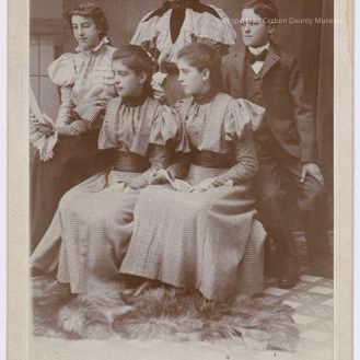 Update - January 2010: Sepia print. Cabinet Card. Studio portrait. Mounted on off-white patterned matboard. Image of four young women & one young man posed seated & standing in front of a painted backdrop. Checkered tile floor & furs under foot. Young man is wearing a plaid, 3-piece suit with white shirt & dark bow tie. Young women are all in dresses; the two in front are identically dressed.