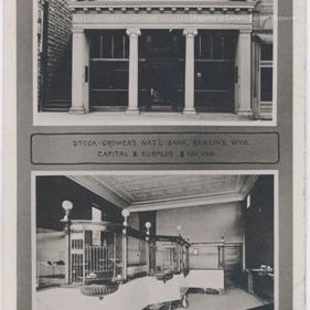 Black & white print card. Two images of the Stock Growers National Bank, one interior & one exterior. The exterior is on top & it has four white pillars, the two in the middle are round & corner ones are square. An ornate peaked roof & facade with "1909" "The Stock Growers National Bank" embossed on front is above entrance door. Lower picture is the interior with teller cages adorned with globe lights on top rail, marble looking base, & pressed tin ceiling. Printed in middle of card in black: "Stock-Grower's Nat'l Bank Rawlins, Wyo. Capital & Surplus $100,000.