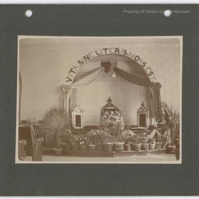 Update 2008: Black and white print affixed to dark grey matboard, which has two holes punched in top. Mat has embossed decorative border along outside edge of textured dimpled design. Photo of interior of a church taken from center aisle that has a white mat? laying on the carpeted floor. Partial pews are seen on side left and right. Focal point of photo is a center platform stage area that is decorated with a semi-circle of potted plants placed along front edge of stage left to right with large eucalyptus plant on each side of the potted plants that are in the row. There is a banner of material draped above the plants behind them. there are two high back throne type chairs at rear of stage on side left and right with a large floral decorated area center rear of stage. The words VITA, SINE LITERS, MORSEST are in a semi circle above stage on frontside facing. A two toned swag drape is gathered at top of wall on center back of stage wall and draped to side left and right with decorative loop at wall edge and hung straight to floor. The walls are light colored.