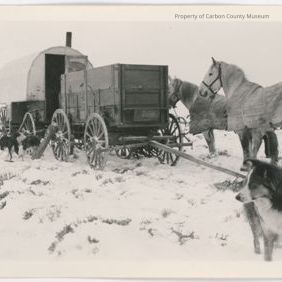 Black & white snapshot print of a sheep wagon, supply wagon, two horses with blankets over their backs & four dogs. Wagon is setting in brush covered with snow. The door to the sheep wagon is open.
