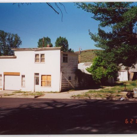 Update 5/2010: Two color snapshots of old building with windows boarded up. It is a story and half tall, upper portion has double windows on 2 sides. Lower level has roll up door, walk in door, 2 small windows, and a large window. A pole gate is folded back against photo right of building. Older buildings in poor condition are in background. Date stamp on bottom right: "6 21 '99". Written on back in black ink: "300 block 8th st. West side, North of alley, R.A. Daley Lumber yard, Cashman Contractors, Yonkee Contractors."