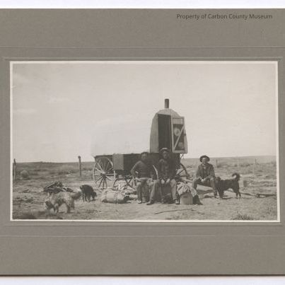 Black & white print on a grey mat. Image of three men sitting in front of a sheep wagon, one is on the wagon tongue. There are three dogs, harness material, canvas rolls & wood crates around the wagon. The door to the wagon is open & two wash pans are hanging on the door.