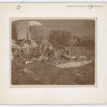 Sepia print on a white mat. Image of two men sitting on a blanket on the ground. They appear to be putting on their boots. The man on the left is wearing dark clothing & smokes a cigarette. He has light colored hair that is unkempt. The man on the right is dressed in medium colored clothing with a dark vest & light neck scarf. He has dark hair. There is a wood spoke wheel buggy with a top setting behind them. Clothing & other items are strewn about on the ground. There is grass in the foreground & bushes behind them.
