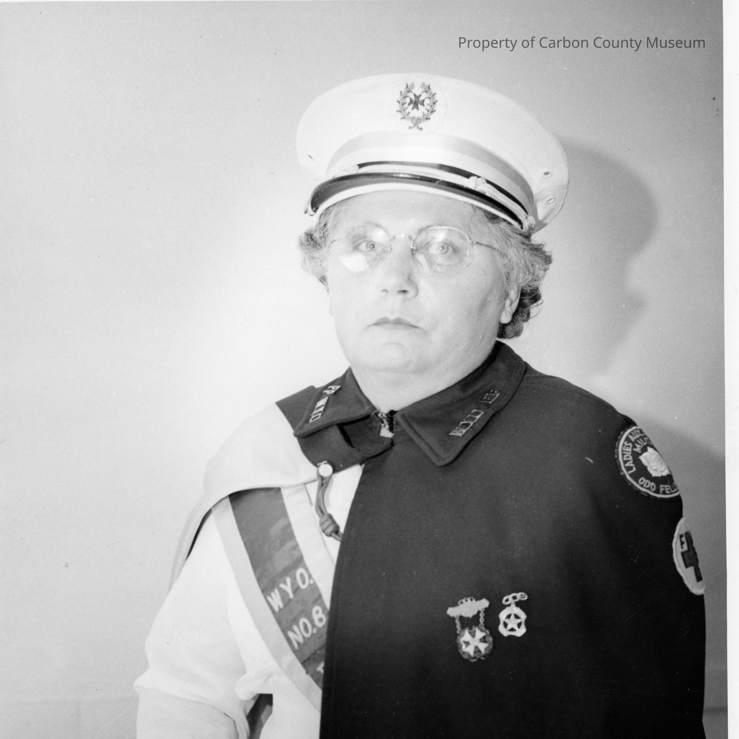 Sash: "Wyo. No 8" can be seen. Cape: Two medals-one with Maltese cross, the other a 5 point star. Two patches on left shoulder. "PP Wyo" pins on the collar, both sides.