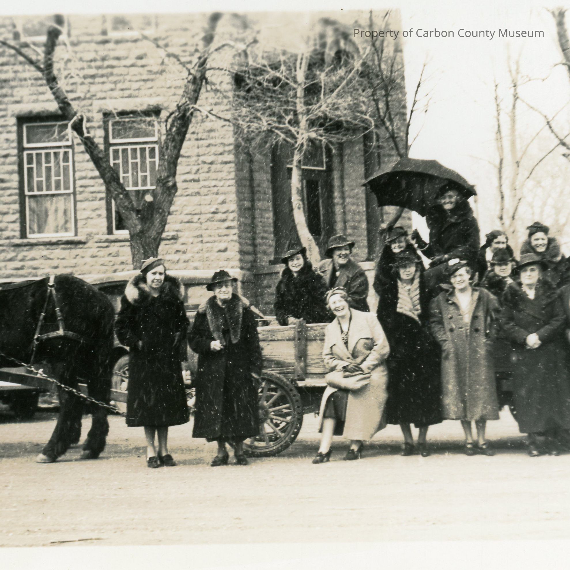Update 2009: Black and white print. Image of a group of 19 women gathered around and on a horse drawn wagon. All posed in front of a large stone building with bare trees. Women are all in dresses, heavy coats and hats.