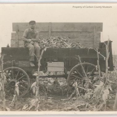 Black & white print of a man sitting on a wood wagon box filled with cobs of corn. Wagon sits among a field of corn stalks. The hind quarters of a horse is seen on photo left.