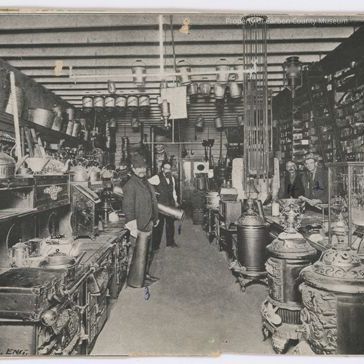 Photo of inside Bennett Hardware. James A. Bennett, Sr., Ed F. Bennett, Loren Earlen, Tom Reid. Taken sometime between 1900 and 1905. This photo was sent to Ed Bennett by Charlie Ross early day resident of Rawlins. He left Rawlins in 1912. This photo was found among his father's photos. You see ranges, parlor stoves, lamps and teakettles.