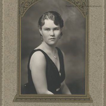 Black & white print of a young lady in a low cut "V" neck, dark colored dress. The dress has no sleeves, just straps over the shoulders. Lady has on a necklace & earrings. Her hair is dark in color & is parted on the right side. Hair lays in waves upon her head & is short cut. There appears to be a belt clasp at the waist & a brooch or clasp at end of the "V".