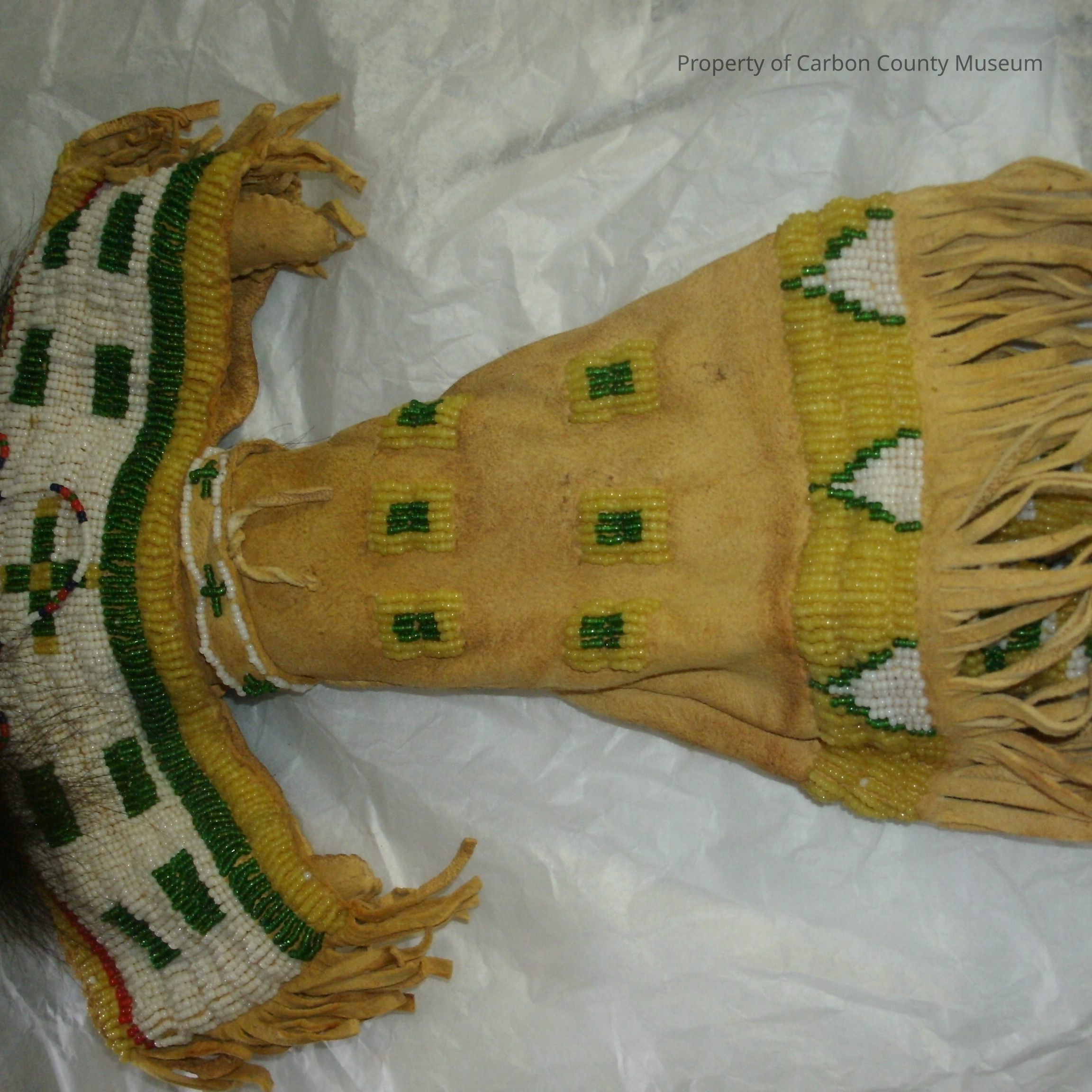 Native American Cheyenne doll wearing a leather beaded dress, shawl, leggings, necklace, and earrings. Dark human hair, (which is sparse and worn). Measures 12 1/8" tall, 9" wide shawl end to shawl end. Leggings are 2" high. Wide shawl is composed of yellow, green, white beads primarily with long red stripe at the top, fringe ends. Beaded face. Belt is tied separately, has design of green beaded x's with white beaded edges. Skirt portion is designed with yellow and green squares, border on lower edge. Yellow, green and white beaded leggings, moccasins are leather with white and green beads. Necklace and earrings are white red, blue beads. Leather is hardening on shawl. Good condition for age.Collection