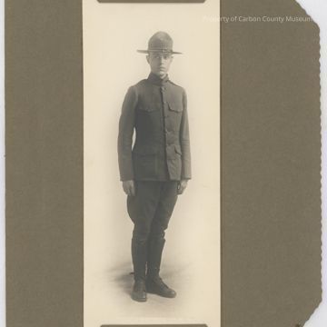 Black & white studio portrait of a soldier in full dress uniform. He is standing at attention with hands down to his side. The soldier looks young. There are no medals or decorations on his uniform.