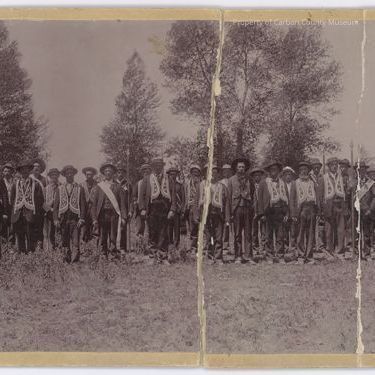Update 2/2010: Black and white print. Snapshot. Mounted on tan matboard .Image of a large group of men posed in an open field with tree in the background. Men are dressed in suits and wear decorated vests or sashes over their clothes. All are wearing hats of one kind or another. Several of the men are holding long carved wood spears in an upright position. Some of the men sport full beards, some just mustaches and some are clean shaven.