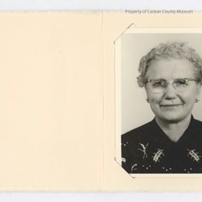 Black & white studio portrait of an elderly lady wearing glasses with short, curly, light colored hair. She is wearing earrings & a high collar dress with a "V" front. The dress is dark colored & has (what appears) to be a corn & wheat design. She has a smile on her face.