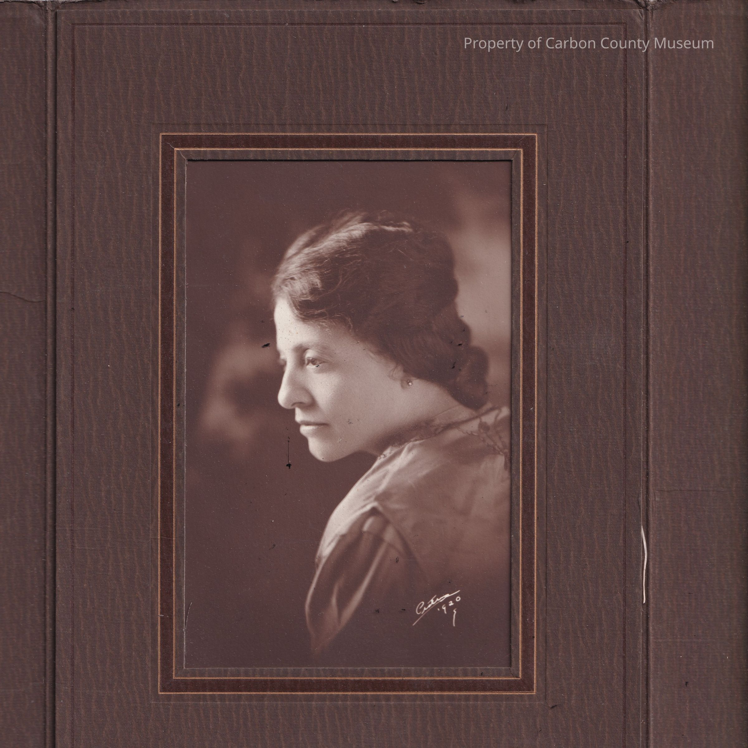 Sepia tone photograph of a woman in a folding cover. Cover is features an embossed logo of a peacock.