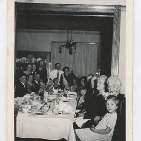 Black & white glossy print & one negative of a family dinner. China cabinet in right side of photo. Curtain behind table on center & left side. Light fixture over table. About 19 people standing & seated around table. White table cloth on table. Place settings still on table. Tall candle in center of table.