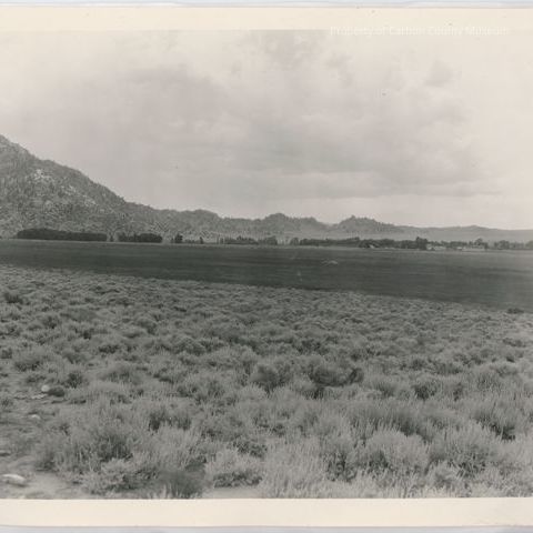 Update 5/2010: Black and white print of ranch buildings, sagebrush in the foreground. A meadow is between brush and buildings. In the background is a steep rock hill with shorter hills continuing to photo right. A row of trees is at the base of hills behind ranch buildings.