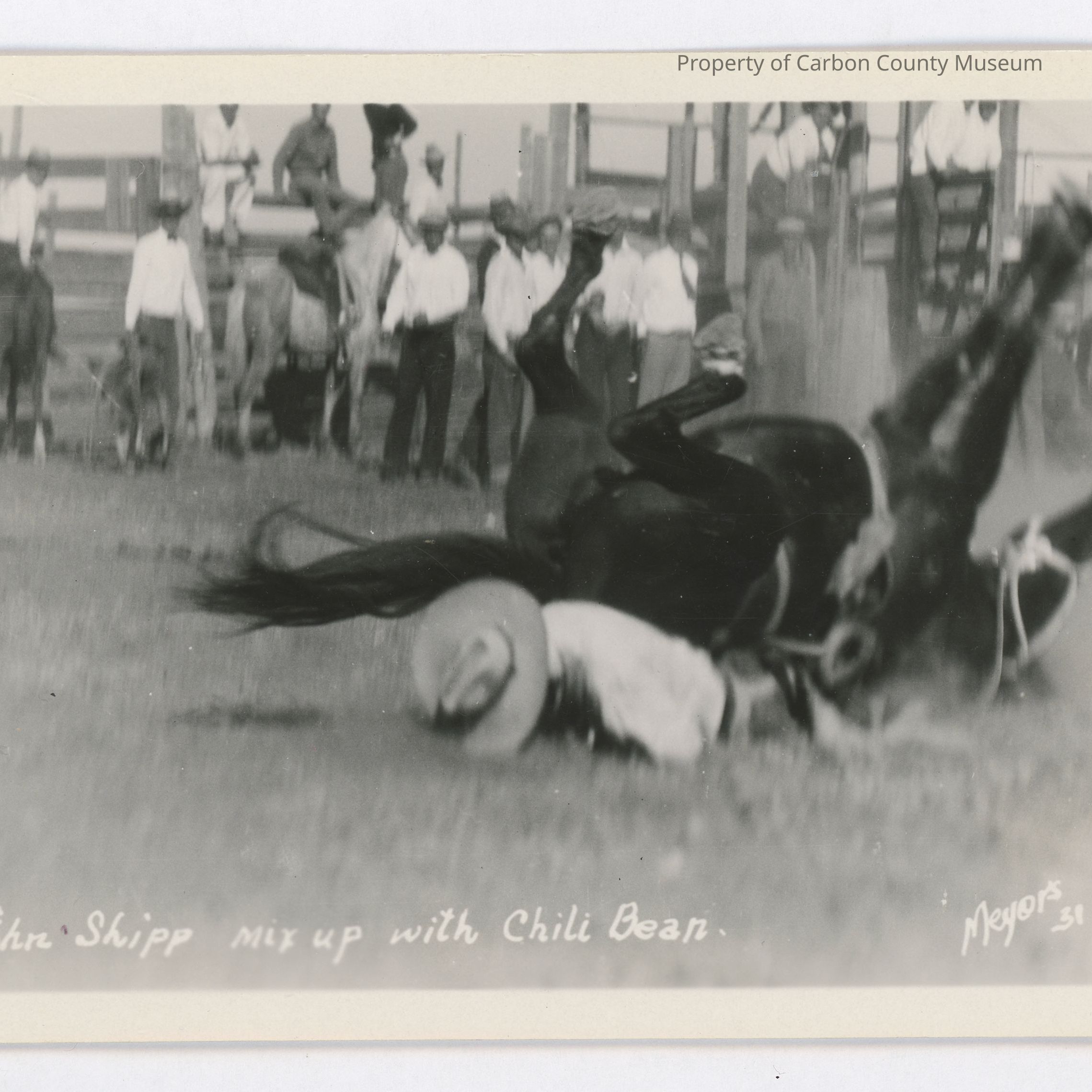 Edit 7/18/2023 by Kelia McCuddy: This is a photograph of John Louis Shipp at the Carbon County Fair September 4th 1931. John was from Rock springs Wyoming annd came to Rawlins for the Carbon County Fair. He Died September 4th 1931 during a bucking horse contest while performing for spectators at the Carbon county fair. He was riding the horse when the animal reared and fell backwards with the rider. It is said that the saddle horn pierced his stomach. His official cause of death was a ruptured aorta.Collection