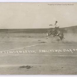 Update March 2011: Black & white print on postcard paper. Image of a bucking bronc with a rider on his back. The horse's front feet are in the air, his back is curved & there is a dust cloud behind him. The cowboy holds his hat in his right hand. Printed in white: "Farrar on Senator Warren Rawlins, Wyo July 4, 1941"