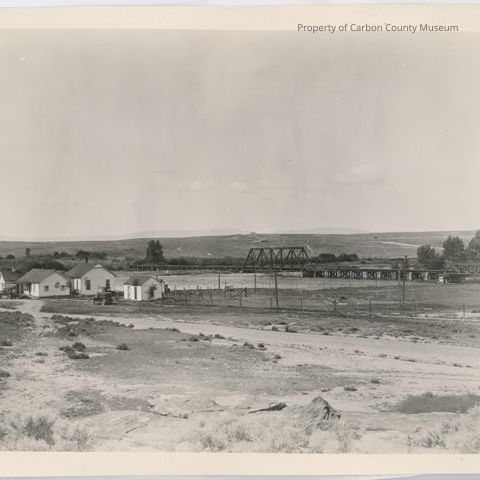 Update 6/2010: Black and white print of the Platte River. It glows behind a cluster of 4 clapboard buildings on photo left . The sign on one reads: "Hot Springs & Bath House." Parked near buildings are 3 vintage cars with wood spoke wheels. A gravel road leads to both houses. On photo right are railroad tracks and a bridge crossing the river. Tracks are held up by large timbers and concrete abutments are on river's edges. Part of bridge crossing water has steel overhead beams, another lower side steel bridge is father toward photo right.