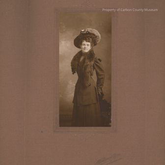 Black and white studio portrait in a tan and brown photo folder. Image of a well dressed woman, wearing a dark, matching long jacket and skirt and high collar blouse with lace. She has a fur around her neck held on with a small link chain attached at the shoulder. Her hat is very ornate and large; it is rolled fur topped with a bow and large feather. She wears gloves and has her left hand behind her on a wood carved chair. Embossed on the left folder flap: "A Portrait." Embossed on inside beneath picture: The Ferris Studio Rawlins Wyo. An embossed raised border and design above and below are around the image. Outside of folder is tan and inside is brown. Written on back of the folder in blue ink: "Sarah Bell Teacher at Rawlins, Wyo 1907." Condition: Good; scuff on image lower right, print edges raising from mat, accretion spot in inside of mat, outside of mat soiled. Size folder open 1 1/4" x 10 7/8."Collection