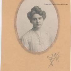 Black and white studio protrait on a tan mat. Image is head and shoulders pose of a woman. Her dress is light colored, pleated and lace bodice with high collar. She wears a long necklace of chain with dangle, and two pins, one at collar and one on her left shoulder. Her hair is dark and parted in the middle in front, curls at sides and in a bun. On the top it is swept up in a full updo. Image is oval shaped with a dark border around oval. Written below picture: "Jukes 1908." Written on back "Margaret Friend (Jacobucci)." Good condition, soiled, dark marks on image corners of mat worn.Collection