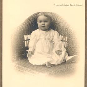 A black and white studio protrait in mottled tan photo folder. Image of an infant sitting in a wicker chair wearing a light colored dress and shoes. The dress is long sleeve with eyelet embroidery trim at wrists and across bodice. A bow is on her left side at the end of the trim. Her hair is short, light colored wih a middle part. Written on inside right photo folder in blue ink: Margaret Leah Jacobucci age 8 1/2 mo. Born Sept. 11, 1918. A raised seal on lower right of photo: H. J. Rogner Rawlins, Wyo. Condition: Good, silvering, lower left mat corner wrinkled.Collection