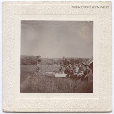 Update 2008: Black and print. Snapshot. Mounted on white patterned matboard. Image of 7 men gathered around a low cloth-covered table set up in a grassy field. Low hills and shrubs in background. Five men are seated at right. Man at center standing with right foot on a stump; man at left is standing and appears to be looking thru a scope?-hands are up in front of his face holding something. Rifles stacked in front of man at left. Man closest to center seated is sighting down a rifle. Bottles and cups on the makeshift table, tent side can be seen at right edge.