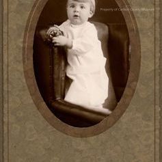 Black and white studio portrait in a brown photo folder. Image of an infant standing in a chair. The chair looks like leather upholstery and the child is beside the arm with his right hand on the front and his left on the top of the wing back. His feet are behind the arm. The child is dressed in a white, long sleeve dress with a wide matching belt and a button front closure. His hair is medium colored, short, with straight bangs. Image is in an oval shape with dark border around it. Printed in brown beneath image: Photo by Stitt. A darker brown design is on outside right flap. Written on back in pencil: Joseph Jacobucci. Good condition, right photo flap worn at top. Size open is 11 1/8" x 9 1/4."Collection