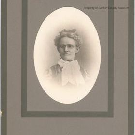 Black and white studio portrait on a two toned grey mat. Image of a woman with medium colored hair. Curly and pulled up in back, there is a black bow tied on top. She has on glasses and a large white bow at her neck that extends over bodice. Her shoulders show a large print dress. Image in oval shape with dark grey border around print and on mat edge. Printed at bottom in brown. "Photo by Jukes." Written on back in pencil: "Mrs I. C. Miller Rawlins, Wyo." Good condition, left mat edge and corners wrinkled and paper missing, right corners worn.Collection