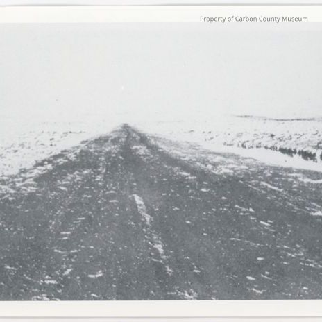 Written on back in black ink: "Winter scene-Lincoln Highway Medicine Bow-Old Carbon Winter 1920-21." Stamped on back in black ink: "Wyoming Highway Department Photo."