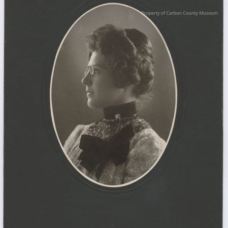 Update 2009: Black and white oval print mounted on black matboard. Lady with left profile. Has high dark collared dress with dark lace on front and large dark bow. Has pinch-nez glasses on. Jewelry pin on collar with chain coming down. Hair pulled up in back, curls on top and over ears.
