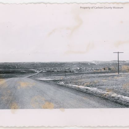 Update 2009: Black and white print of the Town of Medicine Bow. Road leading into town narrows in the distant to cross railroad tracks. buildings in distance. Telephone pole to picture right.