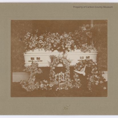 Update 2009 Black and white print affixed to a dark gray mat which has a double scallop border around outer edges. print shows a white decorative casket surrounded by floral arranges on the entire casket top and with several sprays leaning against its visible side. On the last wreath a white dove is seen turned upside down. Dark floral wallpaper is seen on background wall.