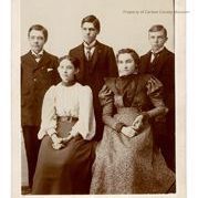 Black and white studio portrait on white card. Image of 3 young boys standing behind two seated young girls. The boys are wearing dark suits, one on left has a bow tie, middle one a long striped tie, and one on right has a long dark tie. Girl on left wears a long sleeve light colored shirt with dark high collar and dark long skirt and belt. Girl on right has a small print dress with a dark wide collar and matching bodice and cuffs and lace top around neck. sprinted at bottom in brown: "A.A. Brown, Photographer, Rawlins, Wyo." Written on back in black ink: "Torrie (sic) Magee, Dee Wren, Kleber Hadsell, Florence Stuver, Irene Daley, class of 1900 Rawlins, Wyo.