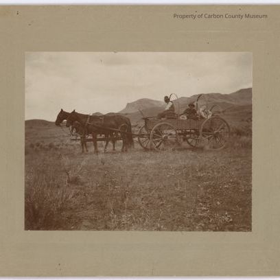 Photo of people in a horse-drawn wagon with supplies from the Battle Mountain Mines. One original and one copy.