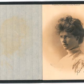 Sepia studio portrait of a young woman. Her hair is in an upswept curly do with loose curls. She wears glasses and her dress is a light colored lace with round collar at neckline. Written in black ink on lower right corner: "Sincerely Elizabeth 1907" Print is in a black paper folder with "Chase Salt Lake" written on outside front flap. A thin sheet of textured paper is in front of print. Good condition, paper folder is curled at top right, rpint soiled and faded onto paper overlay.Collection