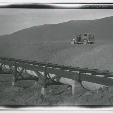 Update 2009: Black and white contact print of vintage car parked next to what appears to be a pipeline. The door is open on the car and it is parked on a road above pipeline. The pipeline is supported by short concrete pillars and wood braces on sides and top. There is a fence above pipeline in photo left.