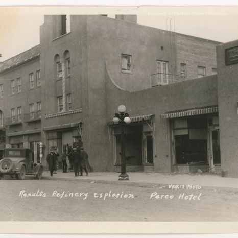 Written on original negative in white: "Results Refinery explosion - Parco Hotel Meyers Photo"