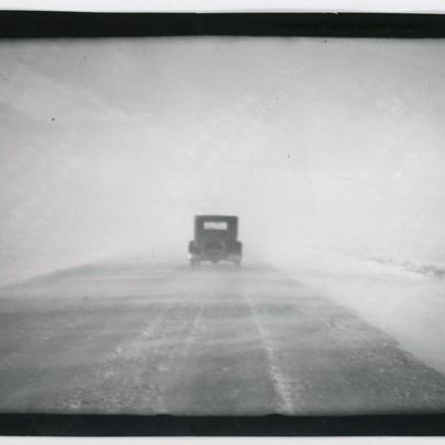 Update 2009: Black and white contact print of a vintage car driving on a road. Snow is driving across road.