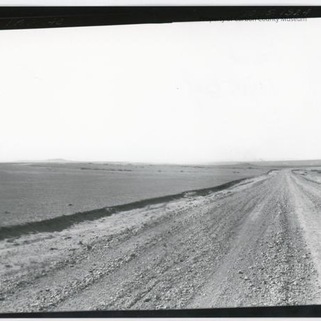Update 2009: Black and white print of gravel road way. Wide in photo foreground and curving right into the distance. Flat terrain to sides of road. Hills visible in the distance.