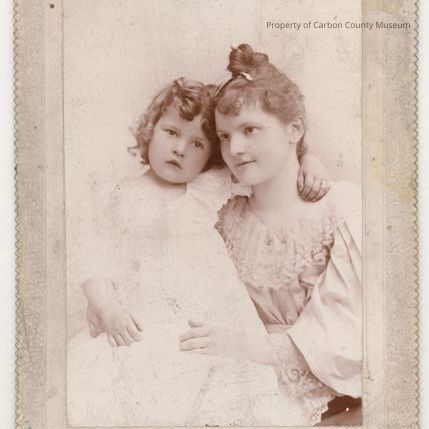Black & white studio portrait on a white mat of a young girl sitting on the lap of a young lady. They both wear light colored frilly dresses. The small child has dark hair in ringlets & the young lady has an updo with decorative barrette & curly bangs.