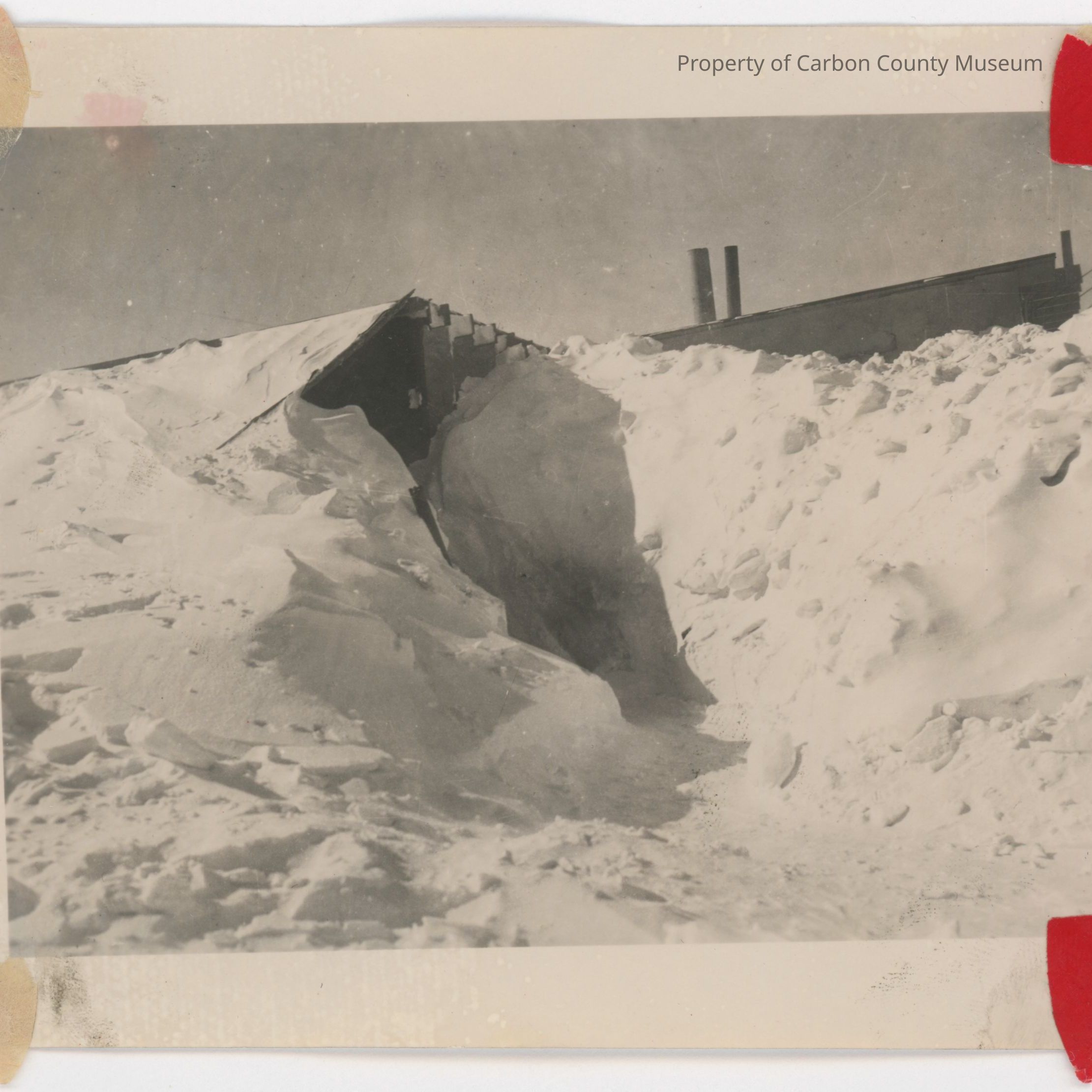 View 13: A tunnel is dug through large snow drifts into the end of a building. Snow is drifted over the side eaves. The roof of another building with chimneys is on photo right with large drift between them.