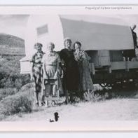 Update 2009: Black & white print. Snapshot. Image of five women and a sheep wagon beside a dirt road with low hill & sagebrush prairie in background. Four of the women are standing in front of the backend of the wagon; one woman is holding a small ladder. Fifth woman standing inside front of wagon. All women in calf-length dresses.