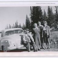 Update - 2009: Black & white print. Snapshot. Image of 3 women & 1 man posed behind an older model automobile; parked on a dirt road with evergreen trees in background. Women are all standing; they are in calf-length dresses. Man is seated on the back pumper of the auto. He is wearing casual attire - jacket, slacks, shirt, tie, & a cap; and he is holding a cup.