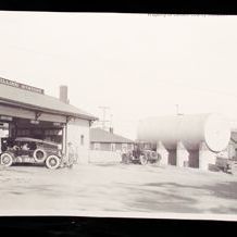 Written on back in pencil: "Aero filling station Corner 8th & Cedar" In blue ink: "First gasoline station in Rawlins"