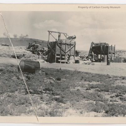 Update 2009: Black and white print of gravel crushing plant. In photo center is a tall wood structure. It is square with extra brace boards framing outside. The top has two more slanted brace boards attached to three board beams on edge of building. There is smoke coming from a piece of machinery to the back of this structures. There is a conveyor belt running between these two. To photo right is a tall chute type hopper for loading gravel into trucks. A ladder is leaning against hopper. A truck is backed in under loading mechanism. Two vintage autos are on right of photo. One left foreground are barrel shaped containers. Other construction debris laying about .